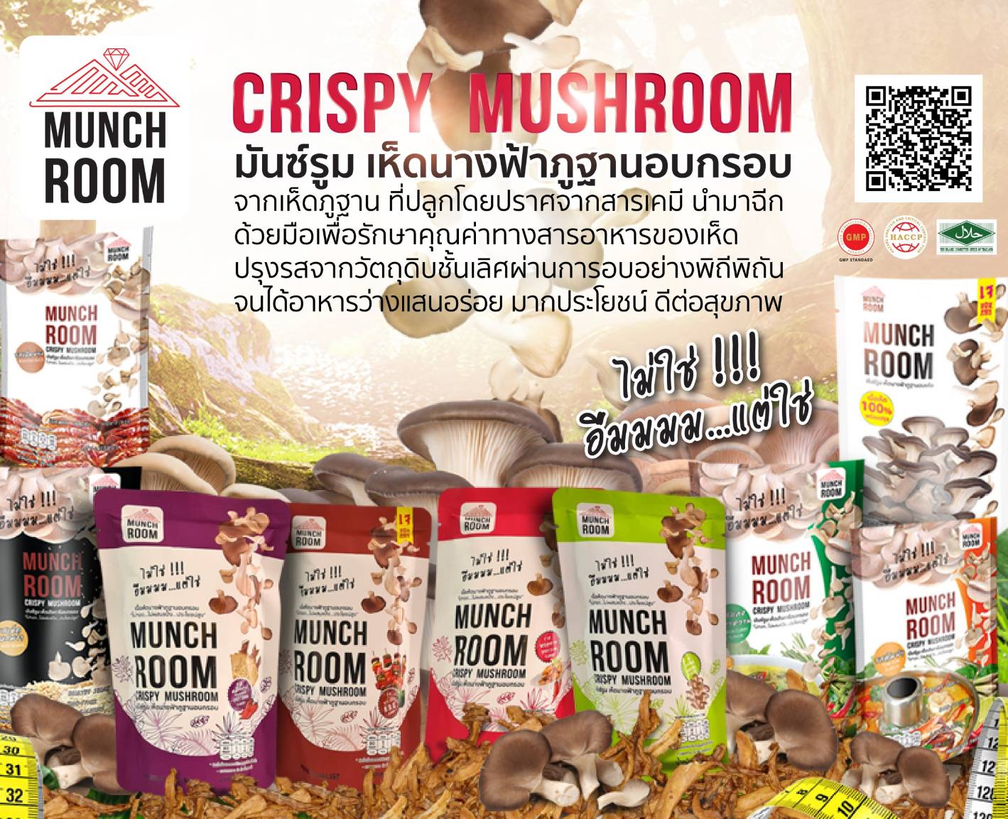 ผลิตและจำหน่ายเห็ดนางฟ้าภูฐานอบแห้ง 100% ที่มาของผลิตภัณฑ์ “จากความห่วงใย นำไปสู่เมนูที่ใส่ใจในสุขภาพ” Munch Room “มันช์รูม เห็ดนางฟ้าอบกรอบ” มีจุดเริ่มต้นจากความห่วงใยคนใกล้ตัว ด้วยความใส่ใจในสุขภาพของลูกชายคนเล็ก ที่ป่วยเป็นเบาหวานตั้งแต่ยังเด็กของ ดร.เขมนัฏฐ์ หล่อศรีศุภชัย ผู้บริหาร บริษัท แอลไลแอนซ์ ฟู้ด เอ็กซ์เพิร์ท จำกัด ทำให้เป็นที่มาของการสร้างสรรค์ขนมขบเคี้ยว (Snack) ที่แตกต่าง เน้นคุณค่าทางโภชนาการ และรสชาติอร่อย ทานได้ทุกเพศทุกวัย “เห็ดนางฟ้าภูฐาน ประโยชน์เกินคาดถึง” ข้อมูลทางโภชนาการระบุว่า เห็ดนางฟ้าภูฐาน มีโปรตีนและเส้นใยอาหารสูง เหมาะกับผู้ที่ต้องการควบคุมน้ำหนัก เห็ดนางฟ้า 100 กรัม ให้พลังงานประมาณ 33 กิโลแคลอรี มีไขมันเพียง 0.07 กรัม แต่มีไฟเบอร์ถึง 0.47 กรัม ช่วยลดคอเลสเตอรอล ลดไขมันในเส้นเลือด ช่วยให้การไหลเวียนโลหิตในร่างกายดีขึ้น มีโพแทสเซียมสูง ช่วยควบคุมจังหวะการเต้นของหัวใจ รวมทั้งความสมดุลของน้ำในร่างกาย และยังช่วยป้องกันโรคมะเร็ง “เหนือมาตรฐาน ปลอดสารเคมี” เห็ดนางฟ้าภูฐานเป็นวัตถุดิบที่ตอบโจทย์เรื่องของคุณค่าทางโภชนาการ และยิ่งไปกว่านั้นเห็ดนางฟ้าภูฐานที่ Munch Room เลือกใช้เป็นเห็ดที่เราเพาะเองและนำมาแปรรูปเอง ฟาร์มของเราได้นำเทคโนโลยีและแอพลิเคชั่นที่ทันสมัยมาควบคุมระดับอุณภูมิภายในฟาร์ม จึงทำให้ทางฟาร์มมีผลผลิตออกตลาดทั้งปี แม้กระทั่งวัสดุที่เลือกใช้เพาะเห็ดก็มาจากธรรมชาติที่ปราศจากสารตกค้างเท่านั้น จึงมั่นใจได้ว่าทุกๆคำที่บริโภคเต็มไปด้วยคุณค่าของสารอาหารที่เป็นประโยชน์คับซองจริงๆ “แปรรูปอย่างใส่ใจ และไม่ลดคุณค่า” เห็ดนางฟ้าภูฐาน ที่ผ่านการคัดสรรแบบเต็มคุณภาพของ Munch Room ถูกนำมาแปรรูปด้วยกรรมวิธีการอบกรอบอย่างพิถีพิถัน ไม่ผ่านการทอด ไม่ใช้น้ำมันจึงได้เนื้อเห็ดนางฟ้าภูฐานที่ปราศจากน้ำมันทรานส์ คอเลสเตอรอลต่ำ ไม่มีแป้งผสม ปรุงรสด้วยสมุนไพรไทยจากธรรมชาติ รสชาติจัดจ้าน ทรงคุณค่าทางโภชนาการ เก็บไว้ได้นานทานเล่นได้ทุกที่ทุกเวลาเมื่อหิว เหมาะสำหรับเป็นของว่างทานเล่น หรือคนที่ต้องการควบคุมน้ำหนัก “ประโยชน์ต้องมี แต่รสชาติต้องดีด้วย” เห็ดนางฟ้าภูฐานอบกรอบของ Munch Room ปรุงรสด้วยส่วนผสมคุณภาพ ควบคุมความหวาน มัน เค็ม โดยเน้นประโยชน์ด้านโภชนาการเป็นสำคัญ ประกอบไปด้วย 4 รส ได้แก่ รสดั้งเดิม กับรสบาร์บีคิว ที่ทานได้ทุกโอกาสแม้ช่วงเทศกาลกินเจและอีก 2 รสชาติเผ็ดร้อน อย่าง รสหอยลายพริกเผา และรสปลาหมึกย่าง ทางเลือกของคนชอบความจัดจ้าน “เน้นคุณค่าทางโภชนาการ ตอ